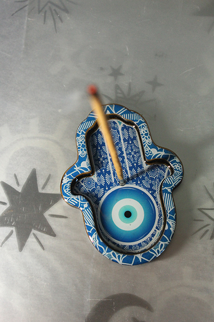Incensário em madeira em formato de hamsá com estampa de olho grego.