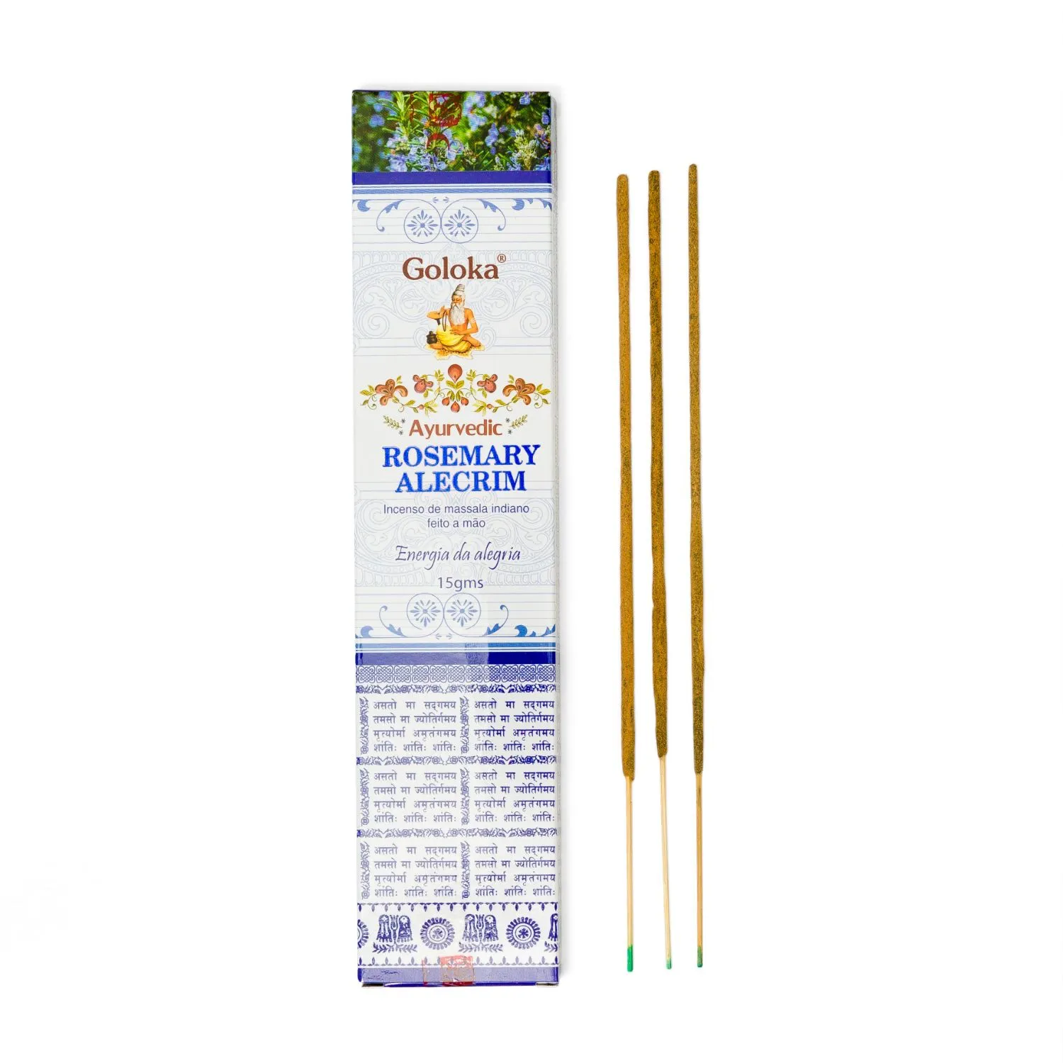 Incenso Goloka Alecrim Promove clareza mental e energia, Ideal para momentos de concentração e renovação, Ajuda a limpar e purificar o ambiente, Equilibra os chakras, Ideal para práticas de meditação e yoga.