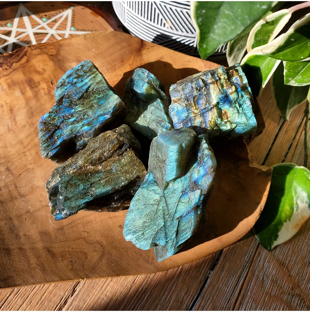 O brilho iridescente da Labradorita, que varia do cinza escuro ao verde, azul e dourado com reflexos luminosos, evoca mistério, proteção e transformação. Sua energia dinâmica ressoa com o chakra do terceiro olho e, em menor grau, com o plexo solar, promovendo intuição, percepção espiritual e clarividência. É um cristal que atua como escudo energético, fortalecendo a aura contra influências negativas e estimulando força interior, coragem e autoconfiança. Representa magia, transformação pessoal e conexão com planos superiores.