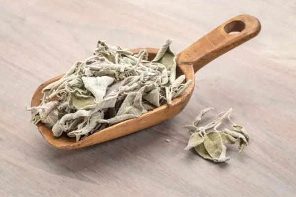 As folhas secas da sálvia, conhecida por suas propriedades calmantes, anti-inflamatórias e antioxidantes.